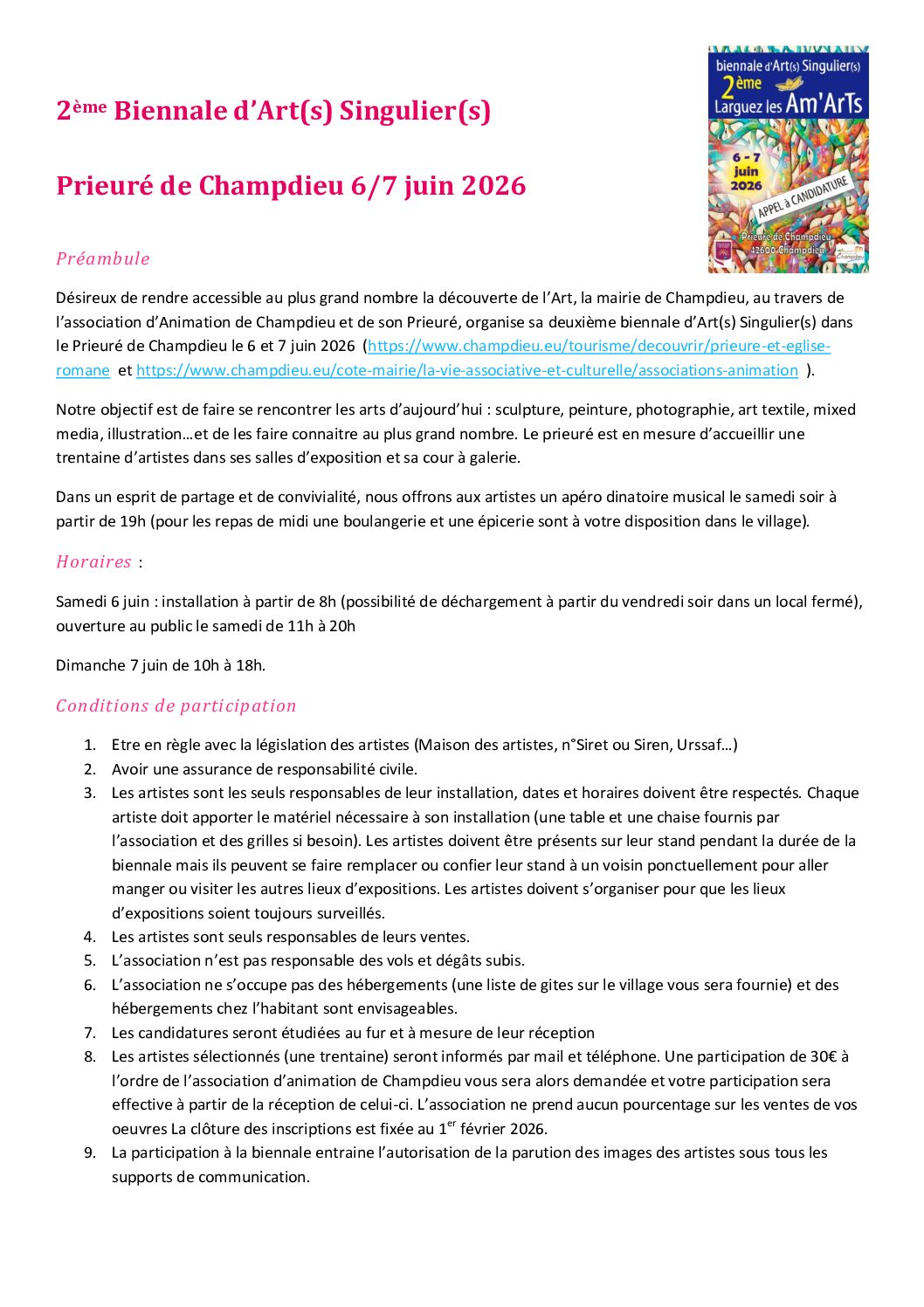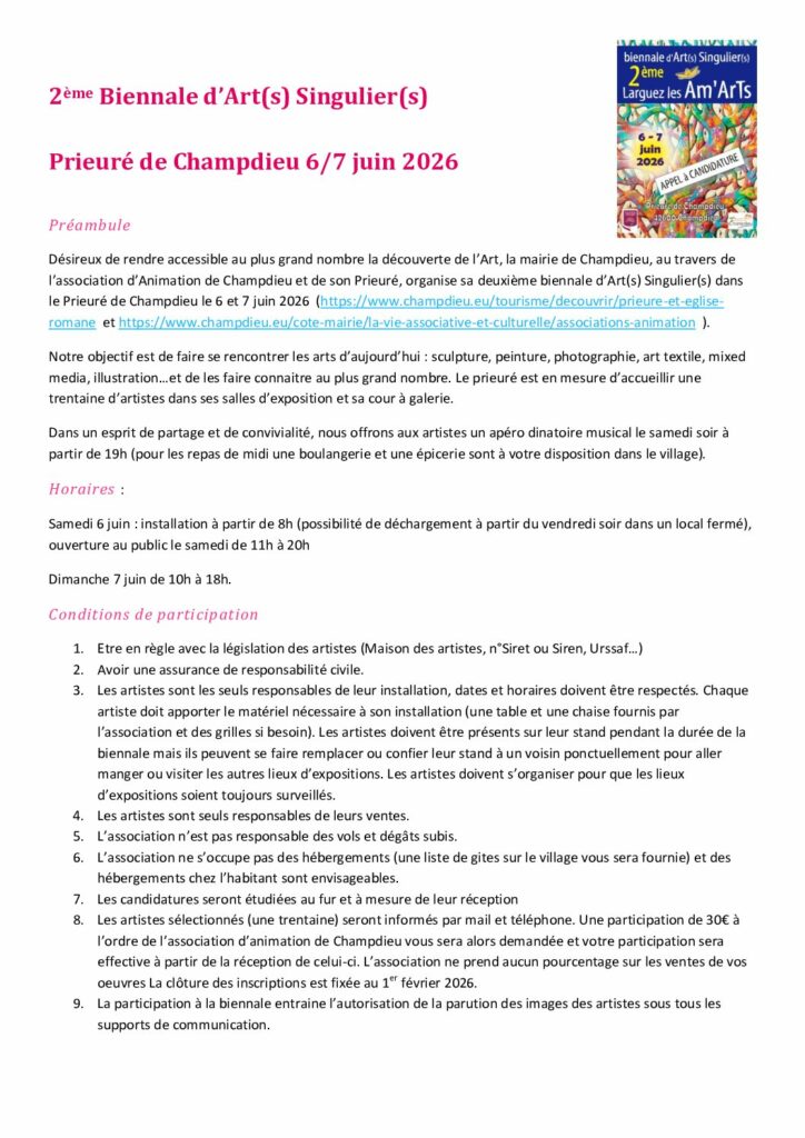 Préambule biennale et conditions de participationPublié 2 octobre 2025 dans 6/7 juin 2026 : Biennale d’Art(s) Singulier(s) de Champdieu – 2ème édition!. https://www.champdieu.eu/wp-content/uploads/2025/10/visuel-biennale-arts-singuliers-2-candidature-appel-2026.jpg