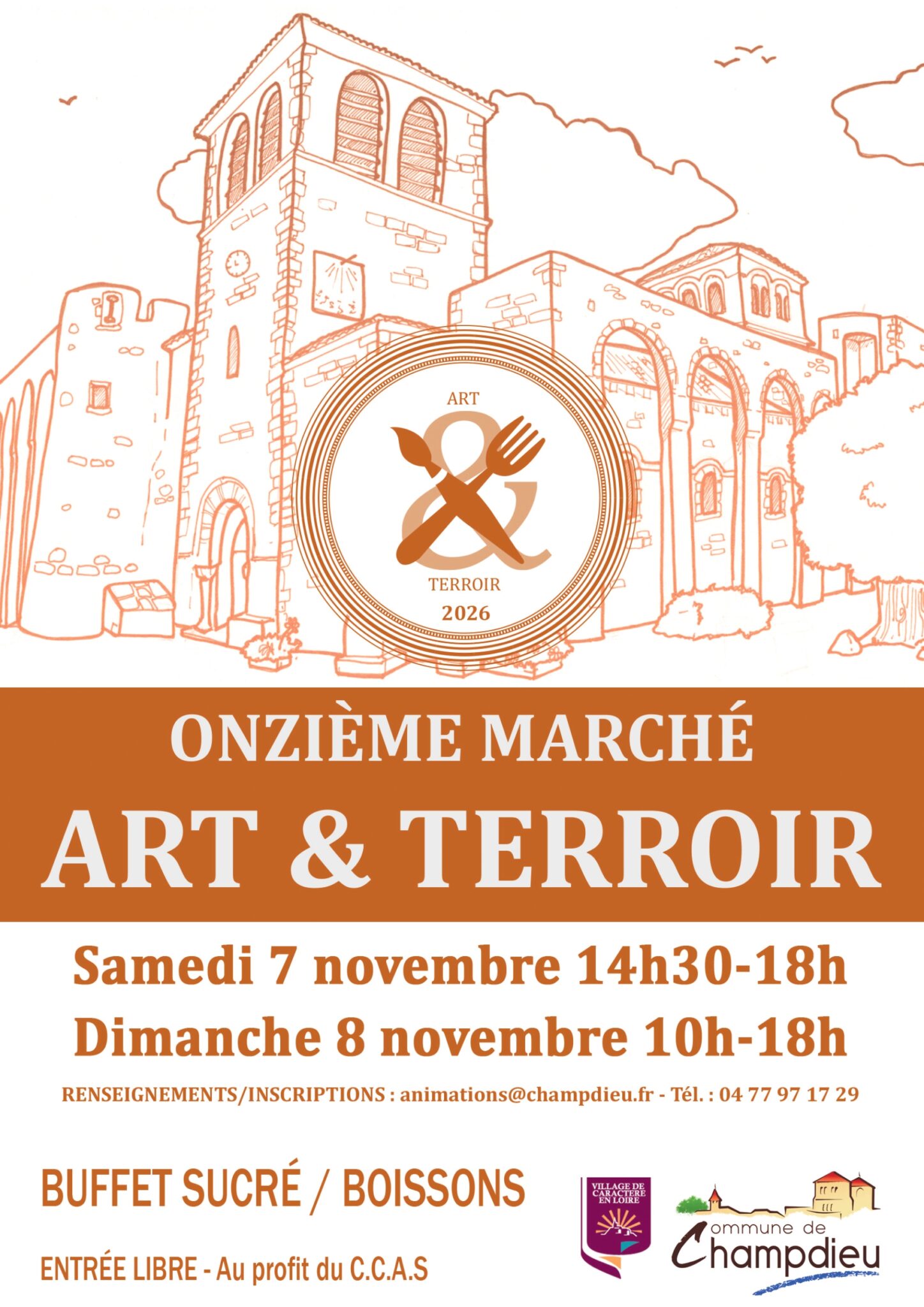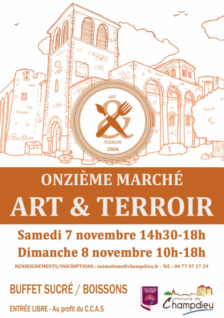 Organisé par le CCAS de la commune de Champdieu (Loire), le 11 ème marché art et terroir se déroulera à l’extérieur dans les deux galeries couvertes du Prieuré au RDC et au 1er étage et la cour ainsi qu’à l’intérieur, salle des fresques, salle des fêtes, la poterie, et les deux salles d’exposition, samedi de 14 h 30 à 18 h et dimanche de 10 à 18 h.