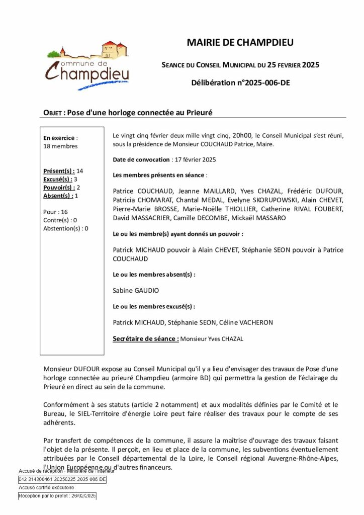 99_DE-DELIB 2025 006 CM du 25 02 2025 Installation d’une horloge connectée pour éclairage du prieuré SPublié 22 octobre 2025 dans Comptes Rendus de Conseils (Champdieu & LFA). ← Précédent https://www.champdieu.eu/wp-content/uploads/2016/10/COMPTE-RENDU.png https://www.champdieu.eu/wp-content/uploads/2025/10/expo-de-classes-d-ecoles--1024x768.jpg https://www.champdieu.eu/wp-content/uploads/2025/10/image001-2.jpg https://www.champdieu.eu/wp-content/uploads/2025/10/image001-3.jpg