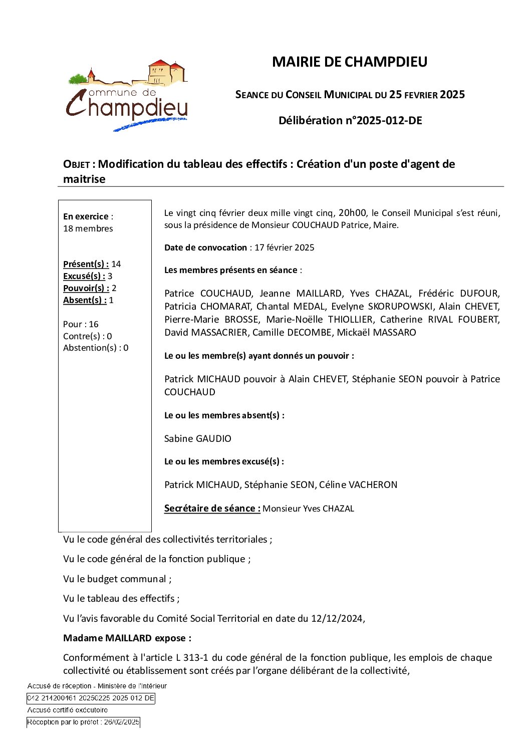 99_DE-DELIB 2025 012 CM du 25 02 2025 Création de poste Agent de maitrise SPublié 22 octobre 2025 dans Comptes Rendus de Conseils (Champdieu & LFA). ← Précédent https://www.champdieu.eu/wp-content/uploads/2016/10/COMPTE-RENDU.png https://www.champdieu.eu/wp-content/uploads/2025/10/image001-2.jpg https://www.champdieu.eu/wp-content/uploads/2025/10/image001-3.jpg