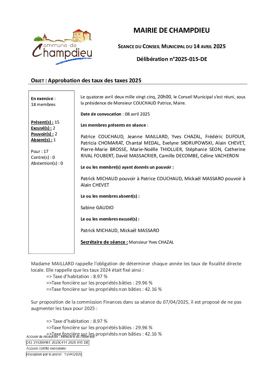 99_DE-DELIB 2025 015 CM du 14 04 2025 Approbation des taux des taxes 2025 SPublié 22 octobre 2025 dans Comptes Rendus de Conseils (Champdieu & LFA). ← Précédent https://www.champdieu.eu/wp-content/uploads/2016/10/COMPTE-RENDU.png https://www.champdieu.eu/wp-content/uploads/2025/10/image001-2.jpg https://www.champdieu.eu/wp-content/uploads/2025/10/image001-3.jpg