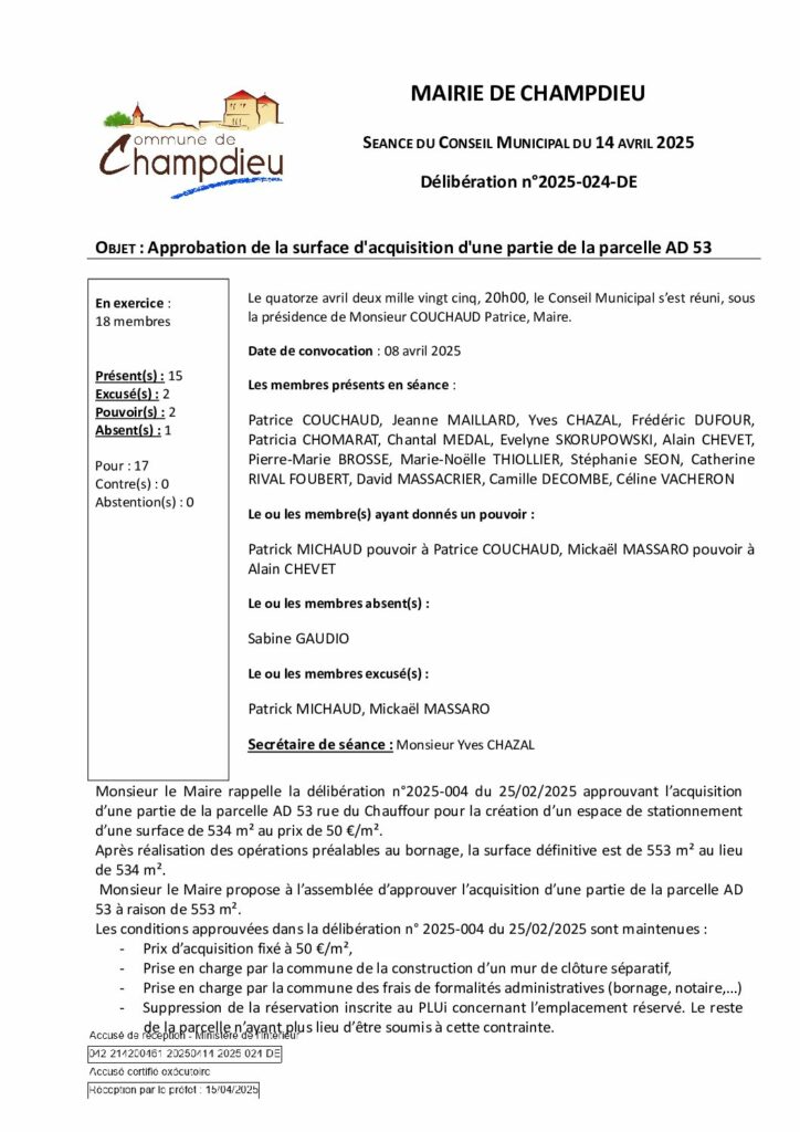 99_DE-DELIB 2025 024 CM du 14 04 2025 Approbation surface d’acquisition de la parcelle AD 53 SPublié 22 octobre 2025 dans Comptes Rendus de Conseils (Champdieu & LFA). ← Précédent https://www.champdieu.eu/wp-content/uploads/2016/10/COMPTE-RENDU.png https://www.champdieu.eu/wp-content/uploads/2025/10/image001-2.jpg https://www.champdieu.eu/wp-content/uploads/2025/10/image001-3.jpg