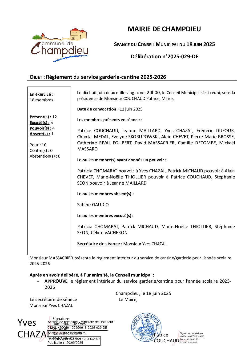 99_DE-DELIB 2025 029 CM du 18 06 2025 Approbation règlement intérieur garderie cantine 2025 2026 SPublié 22 octobre 2025 dans Comptes Rendus de Conseils (Champdieu & LFA). ← Précédent https://www.champdieu.eu/wp-content/uploads/2016/10/COMPTE-RENDU.png https://www.champdieu.eu/wp-content/uploads/2025/10/image001-2.jpg https://www.champdieu.eu/wp-content/uploads/2025/10/image001-3.jpg