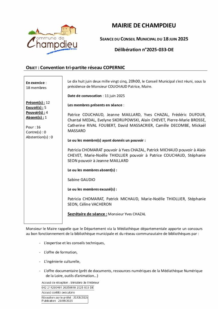 99_DE-DELIB 2025 033 CM du 18 06 2025 Convention tripartite réseau COPERNIC SPublié 22 octobre 2025 dans Comptes Rendus de Conseils (Champdieu & LFA). ← Précédent https://www.champdieu.eu/wp-content/uploads/2016/10/COMPTE-RENDU.png https://www.champdieu.eu/wp-content/uploads/2025/10/image001-2.jpg https://www.champdieu.eu/wp-content/uploads/2025/10/image001-3.jpg
