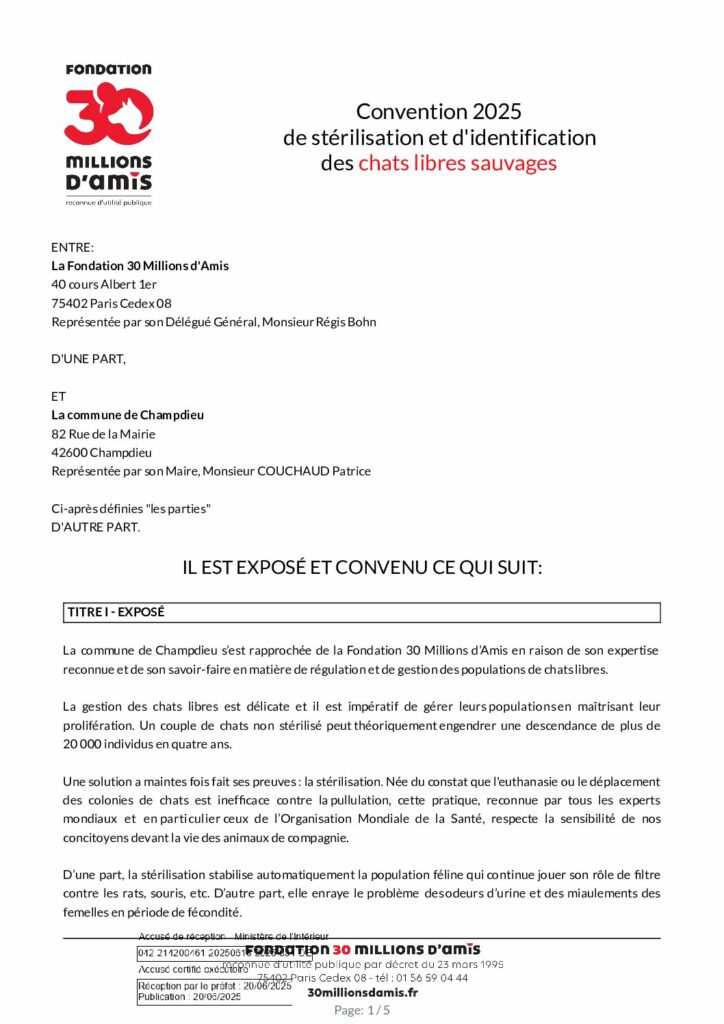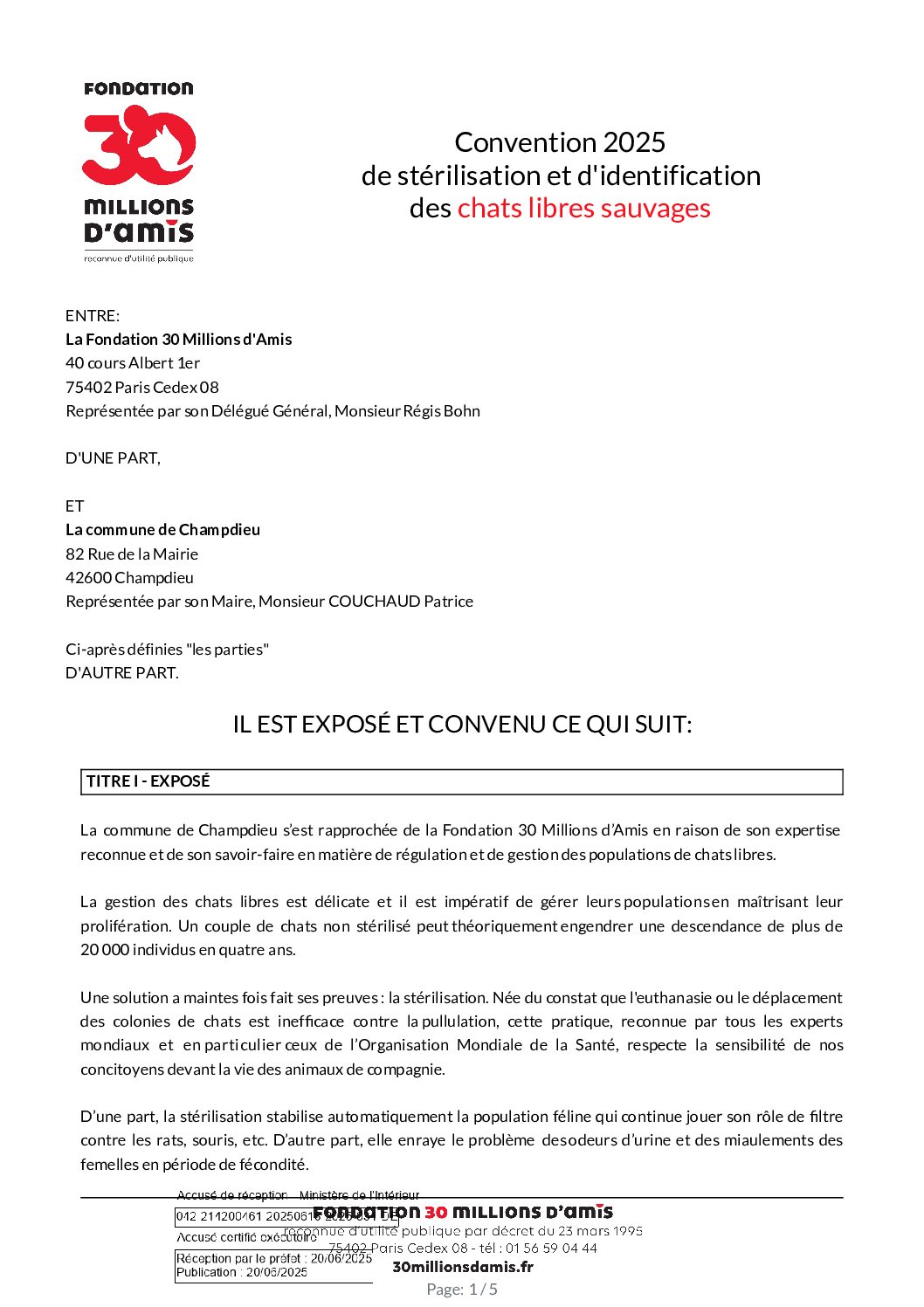 99_DE-DELIB 2025 034 CM du 18 06 2025 ANNEXE Convention stérilisation des chats Fondation 30 M d’amis SPublié 22 octobre 2025 dans Comptes Rendus de Conseils (Champdieu & LFA). ← Précédent https://www.champdieu.eu/wp-content/uploads/2016/10/COMPTE-RENDU.png https://www.champdieu.eu/wp-content/uploads/2025/10/image001-2.jpg https://www.champdieu.eu/wp-content/uploads/2025/10/image001-3.jpg