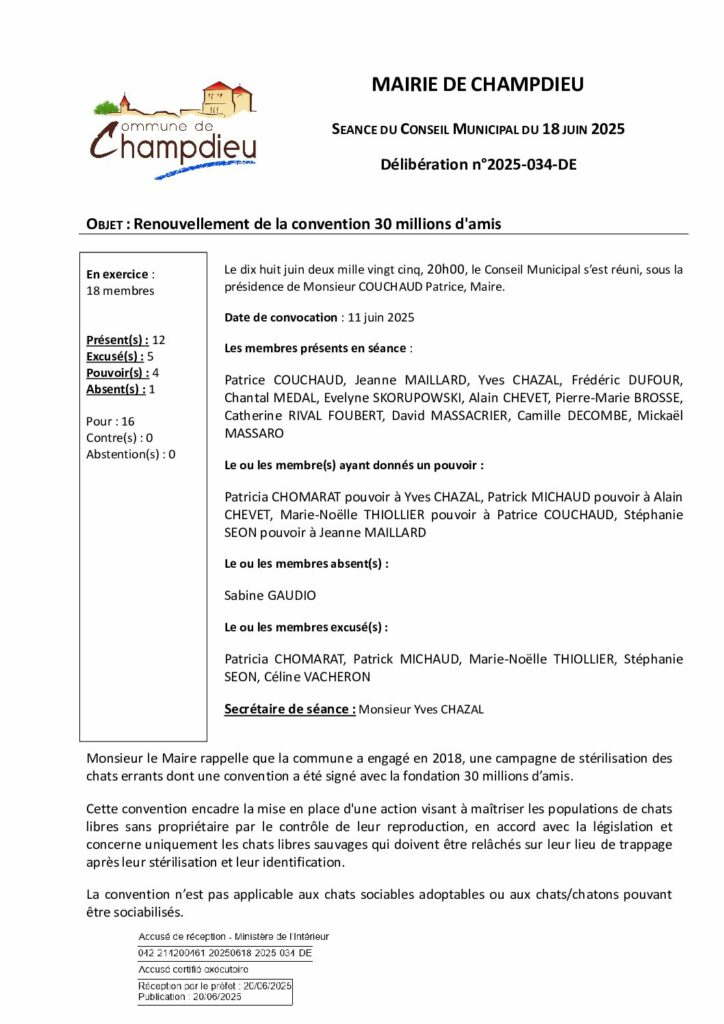 99_DE-DELIB 2025 034 CM du 18 06 2025 Convention stérilisation des chats Fondation 30 M d’amis SPublié 22 octobre 2025 dans Comptes Rendus de Conseils (Champdieu & LFA). ← Précédent https://www.champdieu.eu/wp-content/uploads/2016/10/COMPTE-RENDU.png https://www.champdieu.eu/wp-content/uploads/2025/10/expo-de-classes-d-ecoles--1024x768.jpg https://www.champdieu.eu/wp-content/uploads/2025/10/image001-2.jpg https://www.champdieu.eu/wp-content/uploads/2025/10/image001-3.jpg