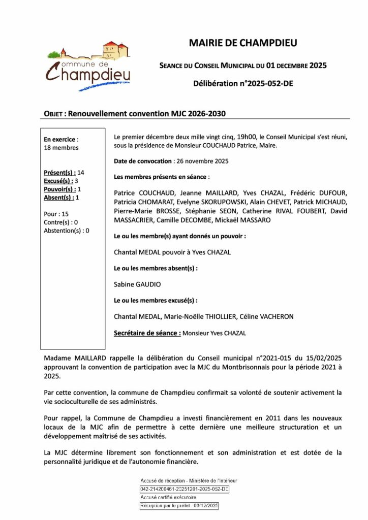 99_DE-DELIB 2025 052 CM du 01 12 2025 Renouvellement Convention MJC 2026 2030 SS publiée le 04 12 2025Publié 4 décembre 2025 dans Comptes Rendus de Conseils (Champdieu & LFA). ← Précédent https://www.champdieu.eu/wp-content/uploads/2016/10/COMPTE-RENDU.png https://www.champdieu.eu/wp-content/uploads/2025/10/expo-de-classes-d-ecoles--1024x768.jpg https://www.champdieu.eu/wp-content/uploads/2025/10/image001-2.jpg https://www.champdieu.eu/wp-content/uploads/2025/10/image001-3.jpg