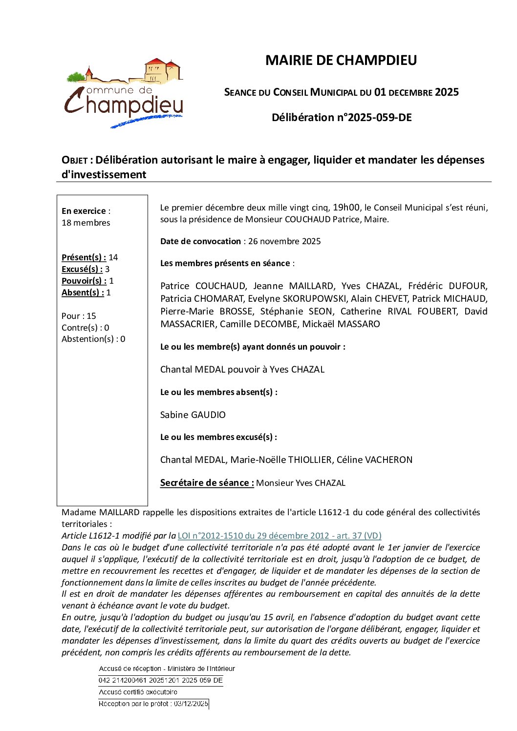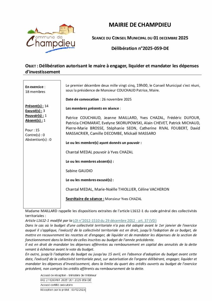 99_DE-DELIB 2025 059 CM du 01 12 2025 Autorisation à mandater liquider les dépenses SS publiée le 04 12 2025Publié 4 décembre 2025 dans Comptes Rendus de Conseils (Champdieu & LFA). ← Précédent https://www.champdieu.eu/wp-content/uploads/2016/10/COMPTE-RENDU.png https://www.champdieu.eu/wp-content/uploads/2025/10/expo-de-classes-d-ecoles--1024x768.jpg https://www.champdieu.eu/wp-content/uploads/2025/10/image001-2.jpg https://www.champdieu.eu/wp-content/uploads/2025/10/image001-3.jpg