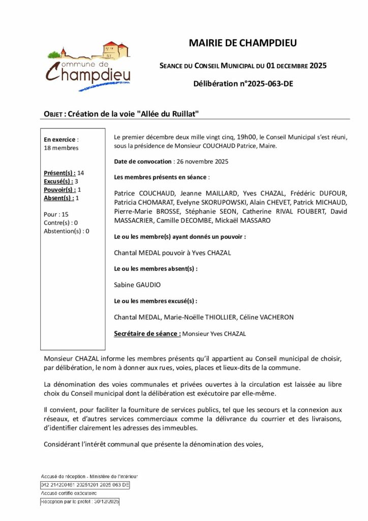 99_DE-DELIB 2025 063 CM du 01 12 2025 Création voie Allée du Ruillat S publiée le 30 12 2025Publié 5 janvier 2026 dans Comptes Rendus de Conseils (Champdieu & LFA). ← Précédent https://www.champdieu.eu/wp-content/uploads/2016/10/COMPTE-RENDU.png https://www.champdieu.eu/wp-content/uploads/2025/10/expo-de-classes-d-ecoles--1024x768.jpg https://www.champdieu.eu/wp-content/uploads/2025/10/image001-2.jpg https://www.champdieu.eu/wp-content/uploads/2025/10/image001-3.jpg