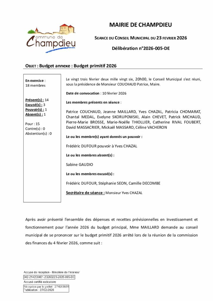 99_DE-DELIB 2026 005 CM du 23 02 2026 Budget Annexe primitif 2026 S Affiché et publié le 27 02 2026Publié 27 février 2026 dans Comptes Rendus de Conseils (Champdieu & LFA). ← Précédent https://www.champdieu.eu/wp-content/uploads/2016/10/COMPTE-RENDU.png https://www.champdieu.eu/wp-content/uploads/2025/10/expo-de-classes-d-ecoles--1024x768.jpg https://www.champdieu.eu/wp-content/uploads/2025/10/image001-2.jpg https://www.champdieu.eu/wp-content/uploads/2025/10/image001-3.jpg