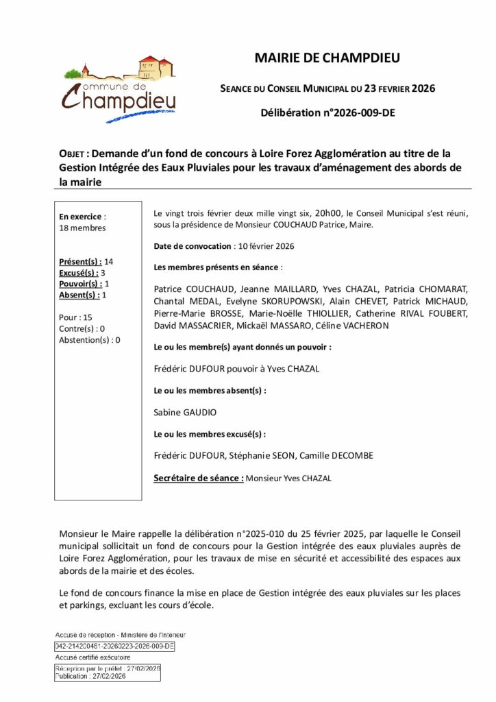 99_DE-DELIB 2026 009 CM du 23 02 2026 Renouvellement dde FDC GIEP LFA S Affiché et publié le 27 02 2026Publié 27 février 2026 dans Comptes Rendus de Conseils (Champdieu & LFA). ← Précédent https://www.champdieu.eu/wp-content/uploads/2016/10/COMPTE-RENDU.png https://www.champdieu.eu/wp-content/uploads/2025/10/expo-de-classes-d-ecoles--1024x768.jpg https://www.champdieu.eu/wp-content/uploads/2025/10/image001-2.jpg https://www.champdieu.eu/wp-content/uploads/2025/10/image001-3.jpg