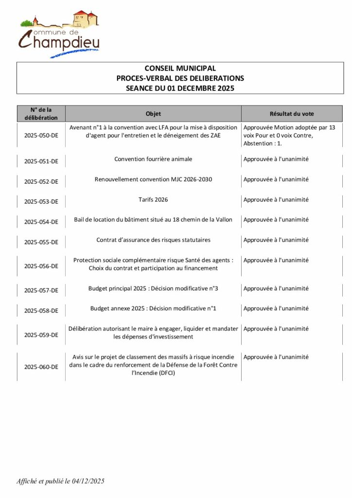 CM du 01 12 2025 Synthèse des délibérations Affichée et publiée le 04 12 2025Publié 4 décembre 2025 dans Comptes Rendus de Conseils (Champdieu & LFA). ← Précédent https://www.champdieu.eu/wp-content/uploads/2016/10/COMPTE-RENDU.png https://www.champdieu.eu/wp-content/uploads/2025/10/expo-de-classes-d-ecoles--1024x768.jpg https://www.champdieu.eu/wp-content/uploads/2025/10/image001-2.jpg https://www.champdieu.eu/wp-content/uploads/2025/10/image001-3.jpg
