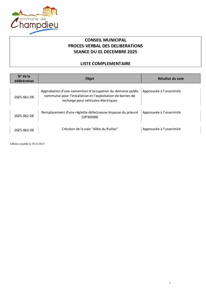 CM-du-01-12-2025-Synthese-des-deliberations-Liste-complémentaire-Affichee-et-publiee-le-30-12-2025Publié 5 janvier 2026 dans Comptes Rendus de Conseils (Champdieu & LFA). ← Précédent https://www.champdieu.eu/wp-content/uploads/2016/10/COMPTE-RENDU.png https://www.champdieu.eu/wp-content/uploads/2025/10/expo-de-classes-d-ecoles--1024x768.jpg https://www.champdieu.eu/wp-content/uploads/2025/10/image001-2.jpg https://www.champdieu.eu/wp-content/uploads/2025/10/image001-3.jpg
