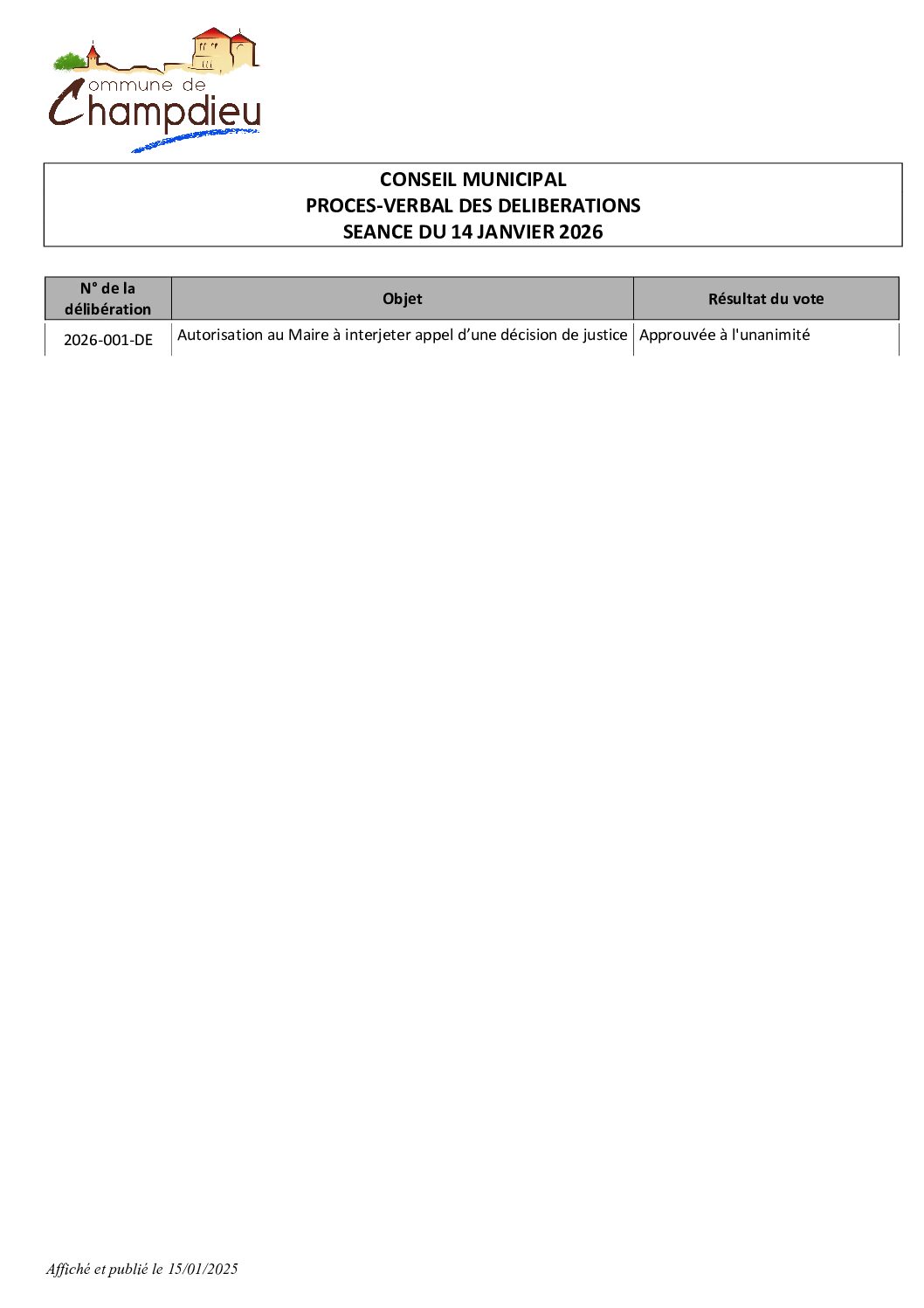 CM du 14 01 2026 Synthèse des délibérations Affichée et publié le 15 01 2026Publié 15 janvier 2026 dans Comptes Rendus de Conseils (Champdieu & LFA). ← Précédent https://www.champdieu.eu/wp-content/uploads/2016/10/COMPTE-RENDU.png https://www.champdieu.eu/wp-content/uploads/2025/10/expo-de-classes-d-ecoles--1024x768.jpg https://www.champdieu.eu/wp-content/uploads/2025/10/image001-2.jpg https://www.champdieu.eu/wp-content/uploads/2025/10/image001-3.jpg