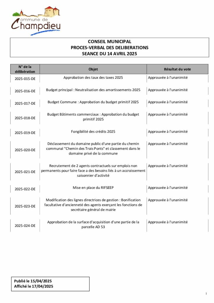 CM du 14 04 2025 Synthèse délibérationsPublié 22 octobre 2025 dans Comptes Rendus de Conseils (Champdieu & LFA). ← Précédent https://www.champdieu.eu/wp-content/uploads/2016/10/COMPTE-RENDU.png https://www.champdieu.eu/wp-content/uploads/2025/10/image001-2.jpg https://www.champdieu.eu/wp-content/uploads/2025/10/image001-3.jpg