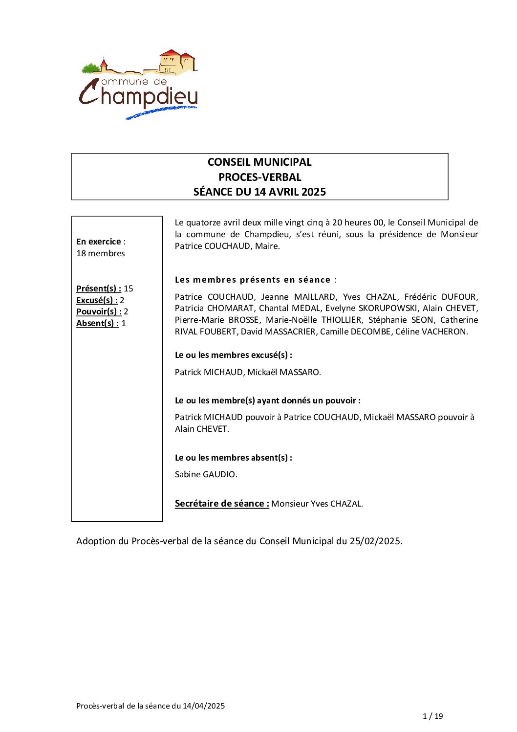 PV CM du 14 04 2025 signatures maire et secrétaire SSPublié 22 octobre 2025 dans Comptes Rendus de Conseils (Champdieu & LFA). ← Précédent https://www.champdieu.eu/wp-content/uploads/2016/10/COMPTE-RENDU.png https://www.champdieu.eu/wp-content/uploads/2025/10/image001-2.jpg https://www.champdieu.eu/wp-content/uploads/2025/10/image001-3.jpg