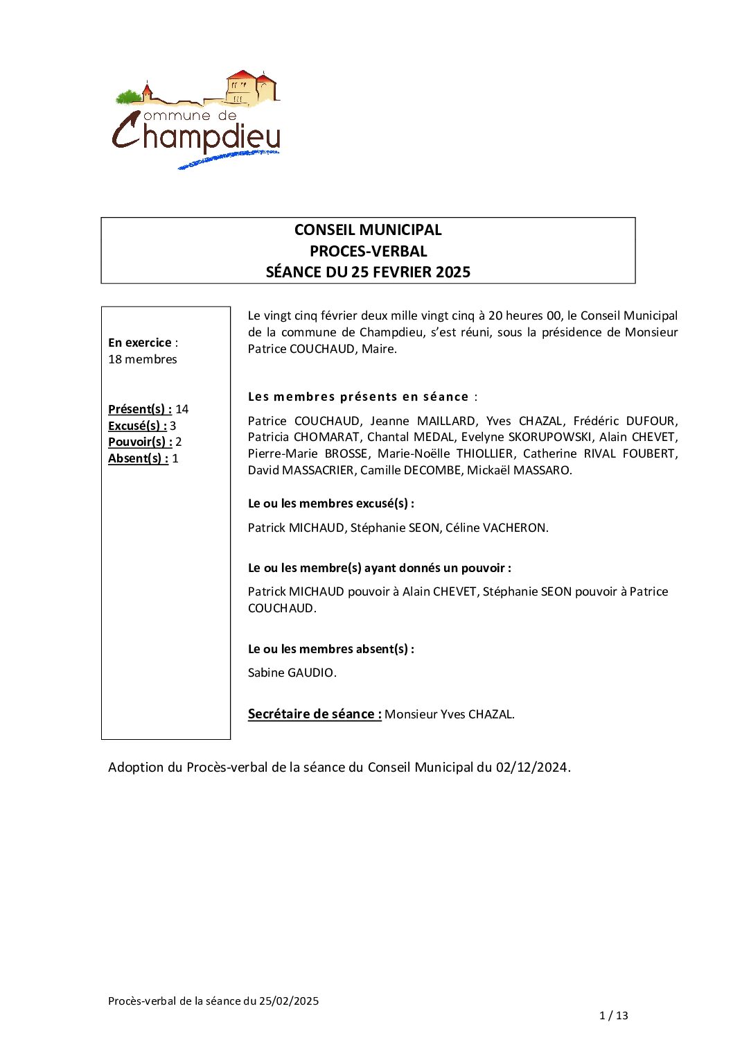 PV CM du 25 02 2025 Maire et secrétaire SPublié 22 octobre 2025 dans Comptes Rendus de Conseils (Champdieu & LFA). ← Précédent https://www.champdieu.eu/wp-content/uploads/2016/10/COMPTE-RENDU.png https://www.champdieu.eu/wp-content/uploads/2025/10/image001-2.jpg https://www.champdieu.eu/wp-content/uploads/2025/10/image001-3.jpg