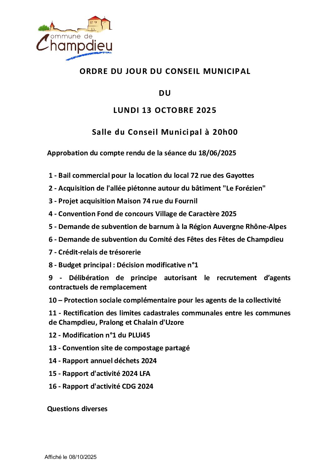 Conseil municipal – ODJ du 13 /10/2025